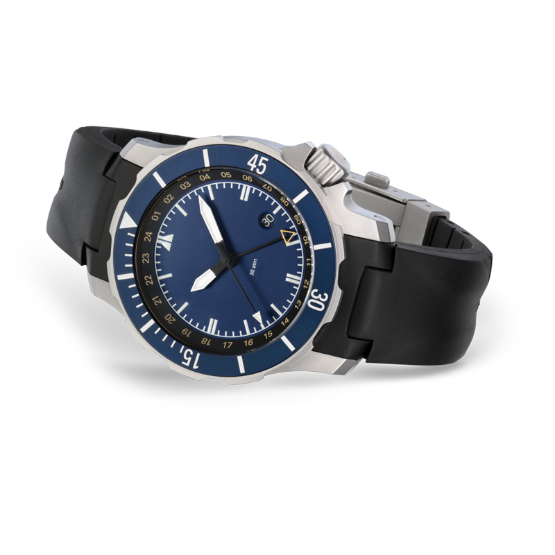 Titanium, Bidirectional bezel, 2.5 mm thick, domed and anti-glare sapphire crystal, Transparent case back, Screw-in crown, Water-resistant to 30 bars, Rubber strap with a stainless steel folding clasp and extension, Screwed strap attachment bridges